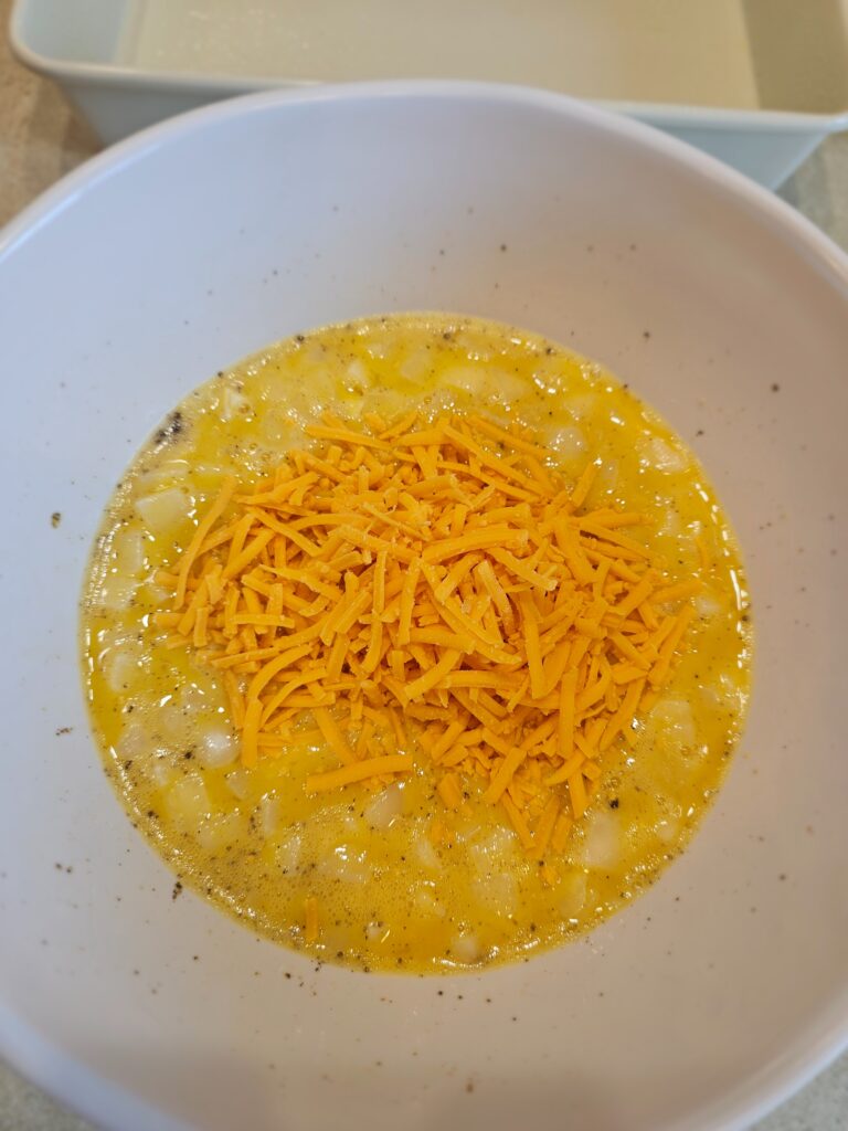 - Next, whisk the eggs in a large bowl. Add the salt, black pepper, milk, potatoes, and cheese whisking to combine well. Then, add the sausage mixture and stir to combine.